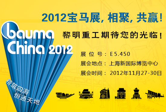 2012年11月27-30日,bauma China 2012—中國國際工程機(jī)械、建材機(jī)械、工程車輛及設(shè)備博覽會(huì),將在上海新國際博覽中心舉辦。截止2012年3月15日,報(bào)名展商數(shù)已達(dá)2143家,超出bauma China 2010展商總數(shù)1858家。屆時(shí),國內(nèi)外業(yè)界領(lǐng)軍企業(yè)、新老展商將攜“當(dāng)家”明星產(chǎn)品悉數(shù)亮相,共同打造行業(yè)盛宴。