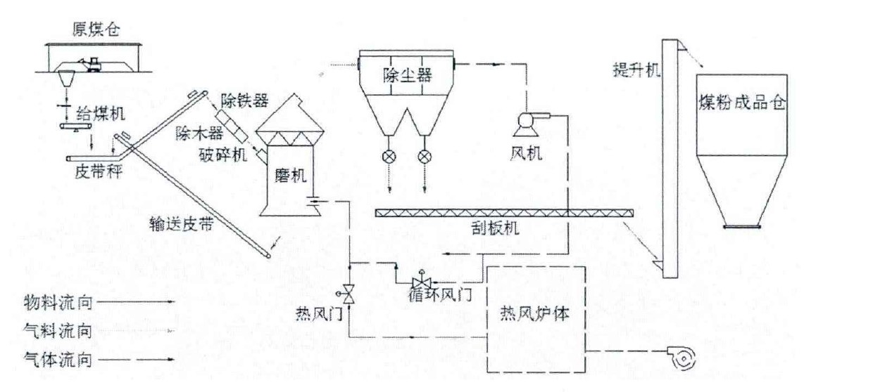 工藝流程:原煤在半敞開(kāi)式干煤棚內(nèi)進(jìn)行自然晾干后裝入原煤倉(cāng),根據(jù)工藝要求原料煤及脫硫劑經(jīng)電子皮帶秤秤重后按比例送入破碎機(jī),煤料在皮帶輸送過(guò)程中需經(jīng)強(qiáng)磁除鐵器除鐵和除木器除木塊,破碎至磨煤機(jī)要求粒度后經(jīng)斗一式提升機(jī)送入磨前料倉(cāng),然后經(jīng)過(guò)給煤機(jī)均勻的送入磨煤機(jī)。由布袋除塵器排除的余熱風(fēng)一部分與熱風(fēng)爐產(chǎn)生的熱風(fēng)混合形成270℃左右的熱風(fēng)被送入磨煤機(jī)作為煤粉的干燥和輸送介質(zhì),另一部分被排入空氣,磨機(jī)出口余熱風(fēng)溫度在70℃左右,此低溫含粉塵余熱風(fēng)經(jīng)過(guò)布袋除塵器后被送入熱風(fēng)爐加熱后循環(huán)使用,合格的煤粉落入底部的輸送機(jī)及提升機(jī)送入成品倉(cāng)儲(chǔ)存。
