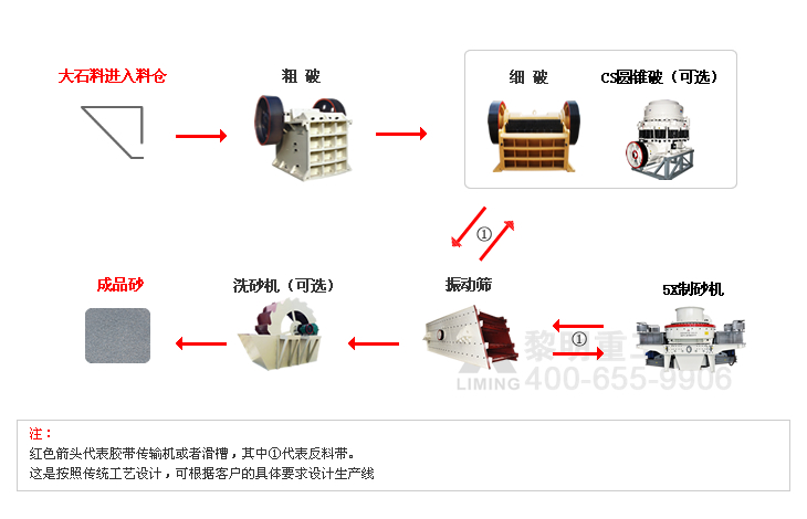 大塊石料經料倉由振動給料機均勻地送進鄂式破碎機進行粗碎,粗碎后的石料由膠帶輸送機送到反擊式破碎機進行進一步破碎,細碎后的石料由膠帶輸送機送進制砂機進行進一步細碎和整形,整形后的石料由膠帶輸送機送進振動篩進行篩分,篩分出幾種不同規(guī)格的砂石,滿足粒度要求的砂石由膠帶輸送機送進洗砂機,清洗砂石中的石粉、泥土,經脫水、分級后送往成品料堆,不滿足粒度要求的石子則由膠帶輸送機返料送到制砂機進行再次破碎、整形,形成閉路多次循環(huán)。