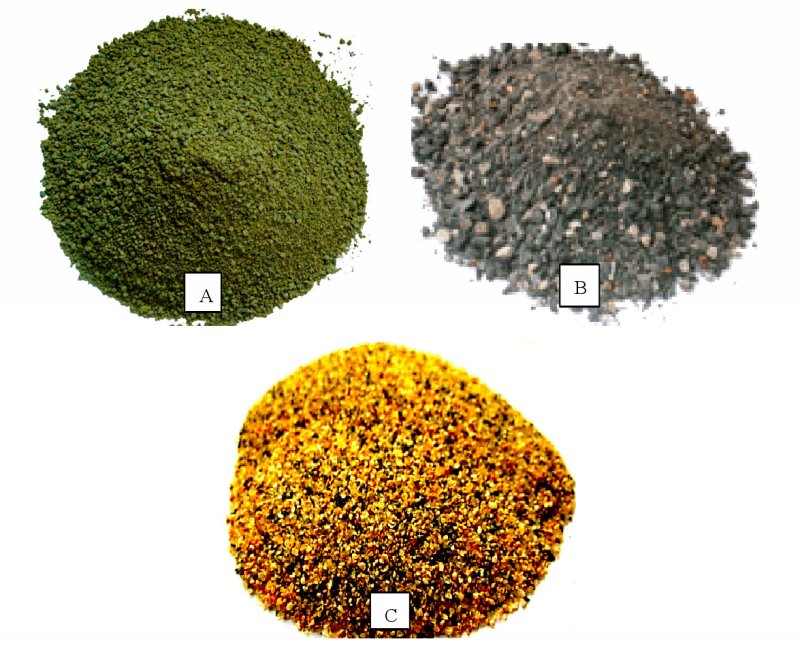 針對石料的形狀劃分了六種不同類別,分別是:圓型、不規(guī)則型、角錐型、扁平型、長條型及扁長型。在這六種形狀中,可以用角錐型和不規(guī)則型形容機(jī)制砂的粒形。機(jī)制砂的粒形因母巖種類不同、機(jī)制砂生產(chǎn)設(shè)備不同也會不同,如下圖A、B兩種機(jī)制砂是不同生產(chǎn)設(shè)備制備的機(jī)制砂,A的粒形較好,B的粒形較差,C是與A、B母巖不同的機(jī)制砂,顏色接近黃沙。
