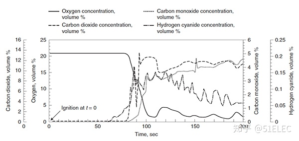圖3:廚房和舞池之間的夜總會中心位置,火災后前200秒(t = 0)的氣體濃度。探測器放在離地面1.5米的地方。(資料來源:國家標準和技術(shù)研究所)